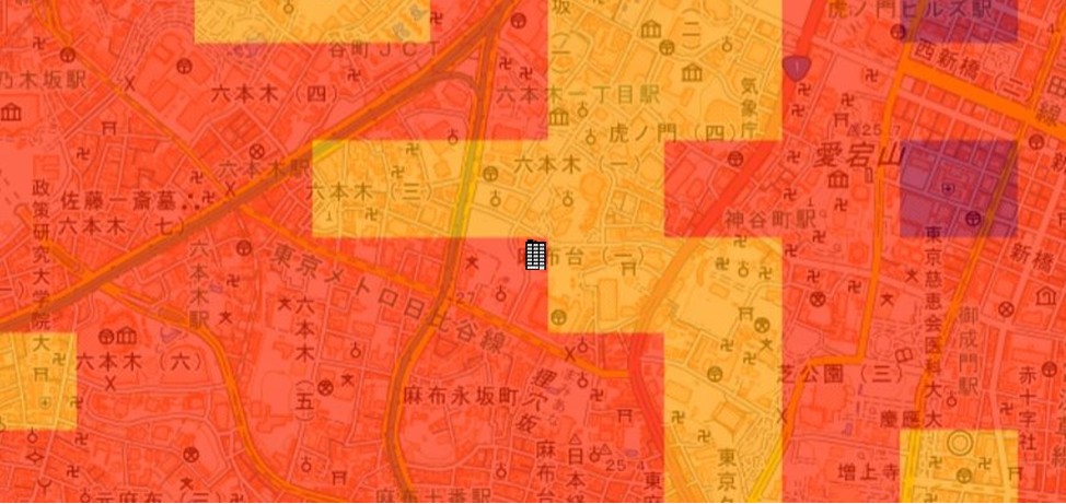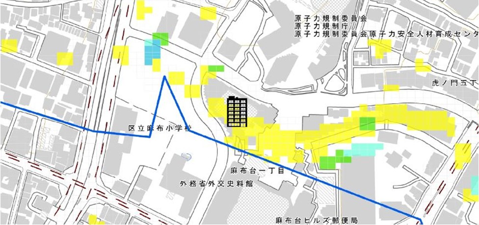 ●東京都の「地震に関する地域危険度測定調査」によると、「麻布台1丁目」の地域危険度は“2”(※)であり、災害に比較的強い地域であるとされています。