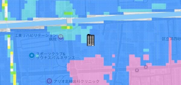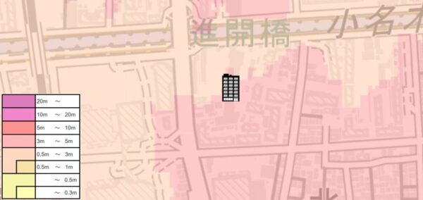 海抜ゼロメートル地帯に位置し、5m超の浸水可能性が指摘されているので、浸水リスクは非常に大きいです。