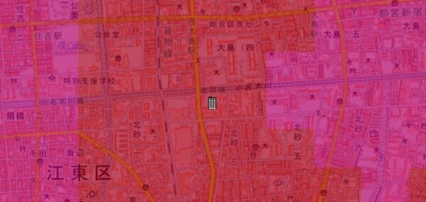 ●東京都の「地震に関する地域危険度測定調査」によると、「大島3丁目」の地域危険度は“5”(※)であり、災害リスクが最悪レベルの地域であるとされています。