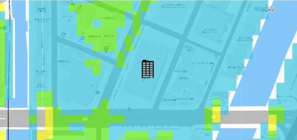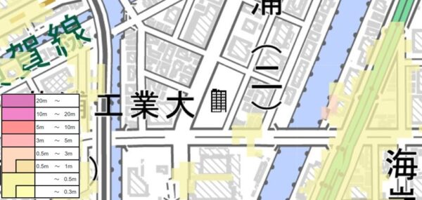 湾岸の埋立地に位置し、約1.3mの浸水可能性が指摘されているので、浸水リスクは顕在です。