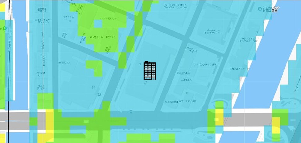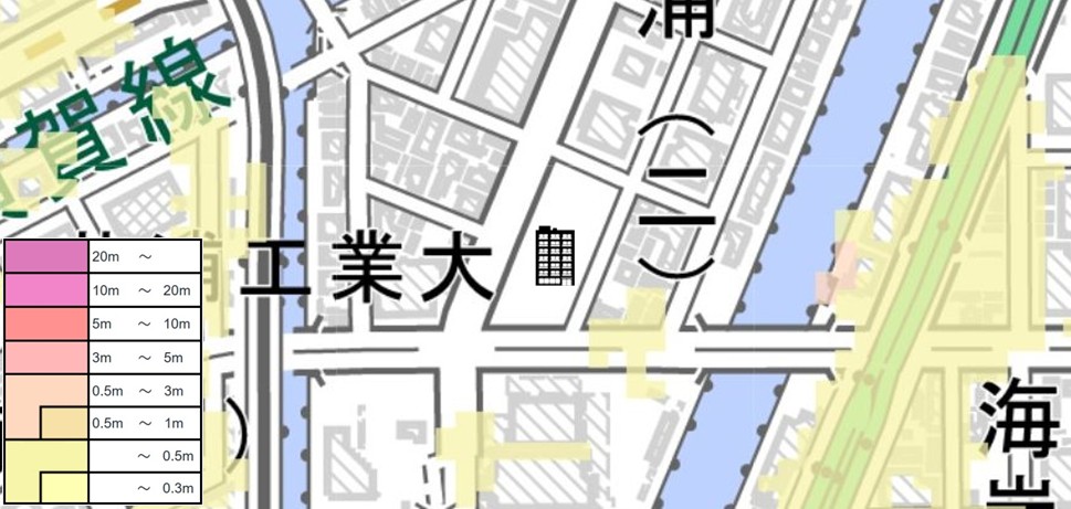 | 【対水害の評価】 [標高・地形] ●標高約2m~3mの湾岸の埋立地に位置します。 〔浸水深〕 ●高潮により約1.3mの浸水可能性が指摘されています。 ●内水氾濫・洪水による浸水可能性は指摘されていません。 〔対水害総評〕 ●湾岸の埋立地に位置し、約1.3mの浸水可能性が指摘されているので、浸水リスクは顕在です。 ●想定を超える高潮や大雨が発生した場合には、浸水被害が拡大する可能性のある立地です。 |