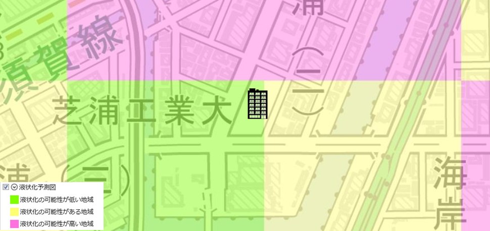 ●東京都建設局が公開している「東京の液状化予測図」では、敷地の一部が「液状化の可能性がある地域に含まれています。