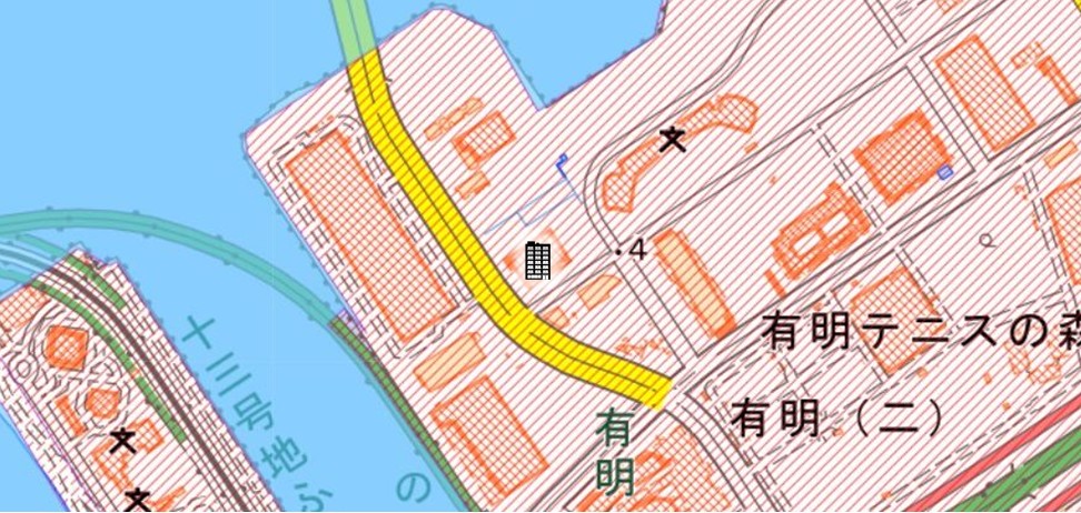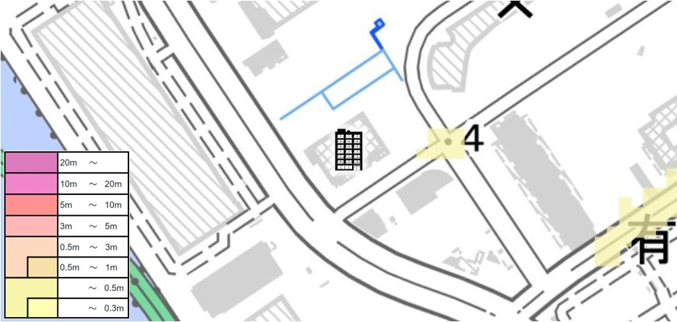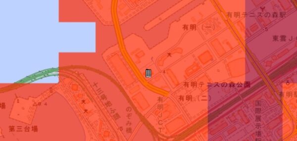 標高4m余りの湾岸の埋立地に位置するので、浸水リスクがないとは言い難いのですが、浸水可能性の指摘がないので、大きな浸水リスクはないとします。