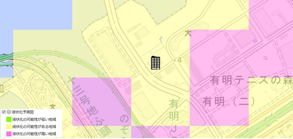 東京都建設局が公開している「東京の液状化予測図」では、「液状化の可能性がある地域」に含まれています。