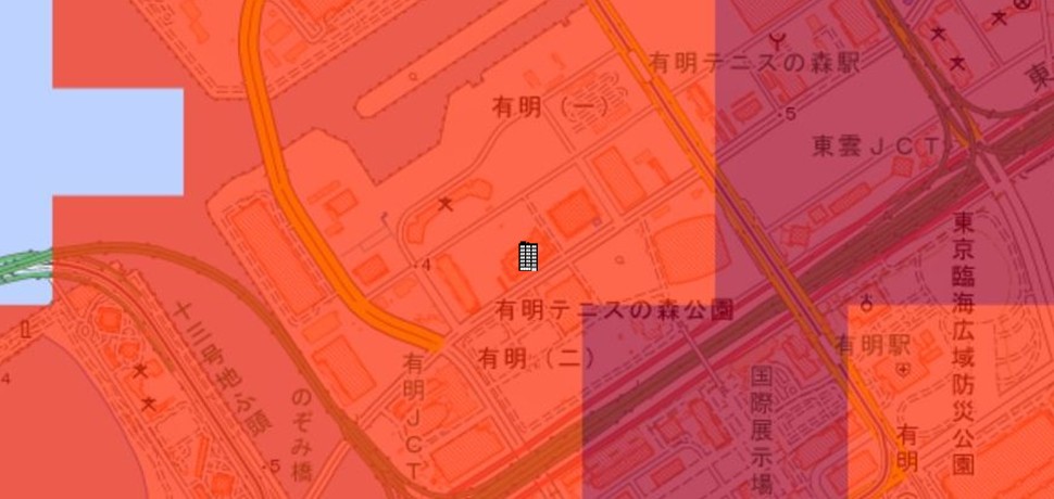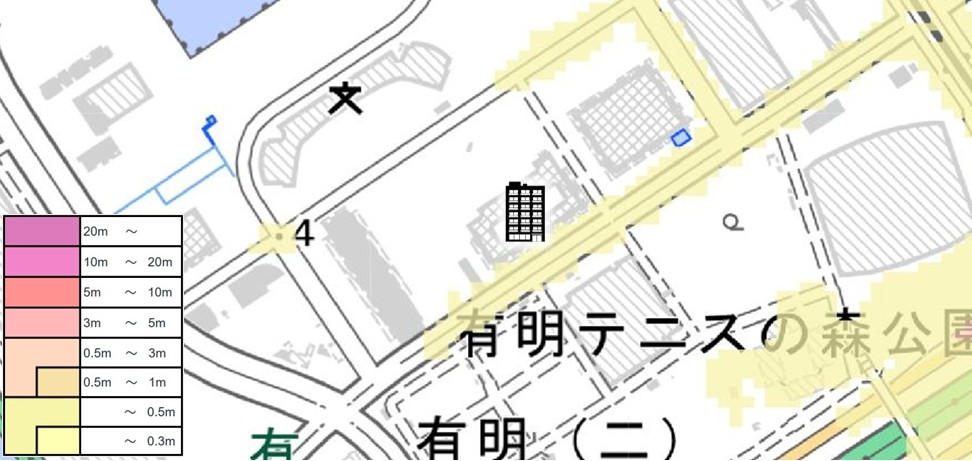 ●浸水可能性の数値は低いですが、標高4m余りの埋立地に位置するので、想定外の浸水被害はあり得ます。