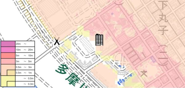 多摩川に近接する低地に位置し、3m以上の浸水可能性が指摘されているので、浸水リスクは非常に大きいです。