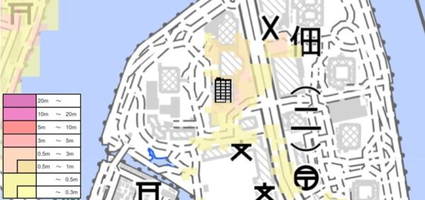 湾岸の埋立地で0.5m~3mの浸水可能性が指摘されているので、浸水リスクは顕在です。