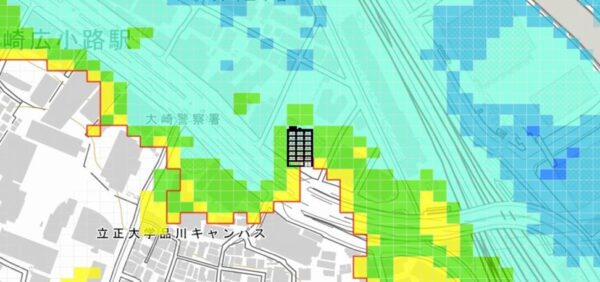 | 【対水害の評価】 [標高・地形] ●標高約5m~6m、目黒川流域の谷底低地に位置します。 ●赤い線で表示される「目黒川が氾濫した場合の浸水区域」に含まれます。 〔浸水深〕 ●最大約1.4mの浸水可能性が指摘されています。 〔対水害総評〕 ●目黒川の氾濫浸水区域内に位置し、約1.4mの浸水可能性が指摘されているので、浸水リスクは大きいです。 ●想定を超える大雨が降った場合には、浸水被害が拡大する可能性のある立地です。 |