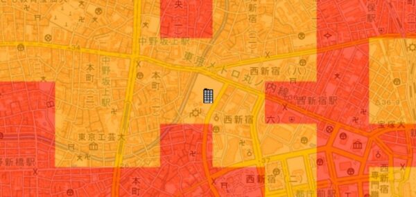 ●東京都の「地震に関する地域危険度測定調査」によると、「西新宿5丁目」の地域危険度は“3”(※)であり、災害リスクが多少残る地域であるとされています。