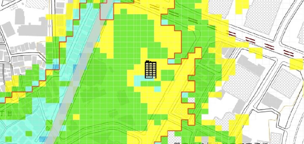 神田川の氾濫浸水区域内に位置し、約1.2mの浸水可能性が指摘されているので、浸水リスクは顕在です。