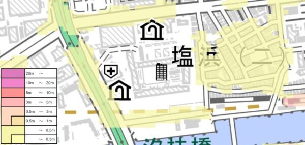 埋立地に位置し、約0.9mの浸水可能性が指摘されているので、浸水リスクは顕在です。