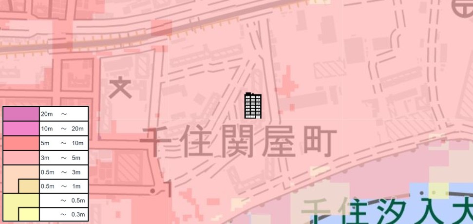 隅田川沿いの低地帯に位置し、3m以上の浸水可能性が指摘されているので、浸水リスクは非常に大きいです。