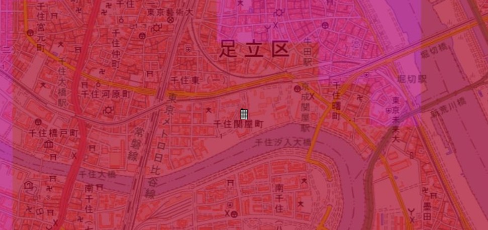 | 【対水害の評価】 [標高・地形] ●標高約1m~2m、隅田川沿いの低地帯に位置します。 〔浸水深〕 ●洪水・内水氾濫により3m~5m未満の浸水可能性が指摘されています。 〔対水害総評〕 ●隅田川沿いの低地帯に位置し、3m以上の浸水可能性が指摘されているので、浸水リスクは非常に大きいです。 ●想定を超える大雨が降った場合には、浸水被害が拡大する可能性のある立地です。 |