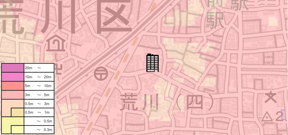 | 【対水害の評価】 [標高・地形] ●標高2m余り、東京東部の低地帯(地形は、河川沿いの微高地)に位置します。 ●河川沿いの微高地は、現在及び過去の河川沿いにあって、河川の洪水によって形成された地形です。 〔浸水深〕 ●洪水・内水氾濫により3m~5m未満の浸水可能性が指摘されています。 〔対水害総評〕 ●低地帯に位置し、3m以上の浸水可能性が指摘されているので、浸水リスクは非常に大きいです。 ●想定を超える高潮や大雨が発生した場合には、浸水被害が拡大する可能性のある立地です。 |