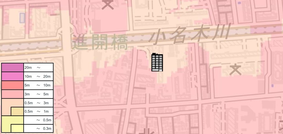 | 【対水害の評価】 [標高・地形] ●標高0m前後の「海抜ゼロメートル地帯」に位置します。 〔浸水深〕 ●高潮により最大約4.1mの浸水可能性が指摘されています。 ●洪水・内水氾濫により0.5m~3mの浸水可能性が指摘されています。 〔対水害総評〕 ●「海抜ゼロメートル地帯」に位置し、4m超の浸水可能性が指摘されているので、浸水リスクは非常に大きいです。 ●想定を超える高潮や大雨が発生した場合には、浸水被害が拡大する可能性のある立地です。 |
