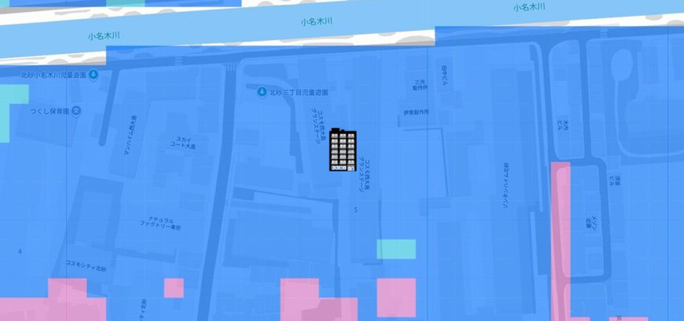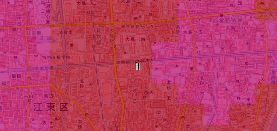 ●東京都の「地震に関する地域危険度測定調査」によると、「北砂3丁目」の地域危険度は“5”(※)であり、災害リスクが最悪レベルの地域であるとされています。