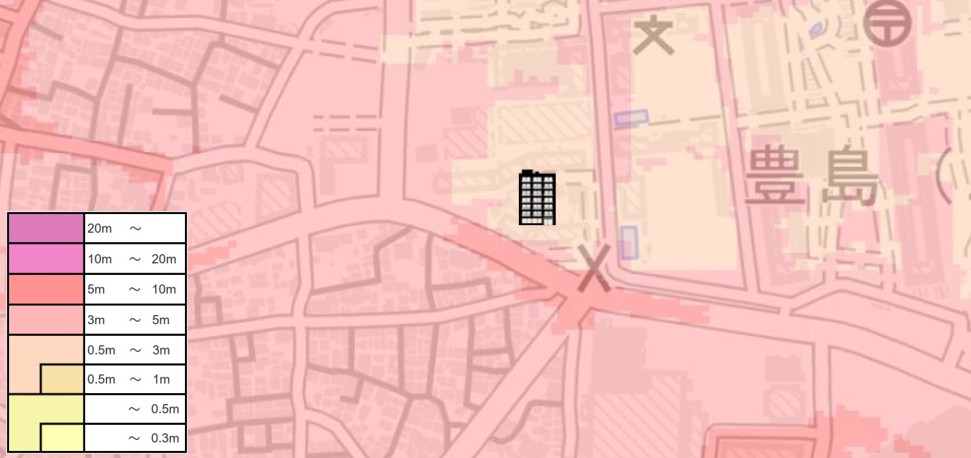 | 【対水害の評価】 [標高・地形] ●標高4m前後、隅田川に近接する低地帯に位置し、河岸との標高差は2~3m程度です。 〔浸水深〕 ●高潮により最大約1.4mの浸水可能性が指摘されています。 ●洪水・内水氾濫により0.5m~3m未満の浸水可能性が指摘されています。 〔対水害総評〕 ●隅田川に近接し、1m超の浸水可能性が指摘されているので、浸水リスクは大きいです。 ●想定を超える高潮や大雨が発生した場合は、浸水被害が拡大する可能性のある立地です。 |