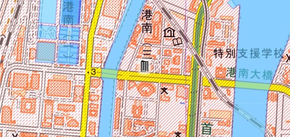 ●標高約3m~4mの湾岸の埋立地(昭和初期に埋立)に位置します。