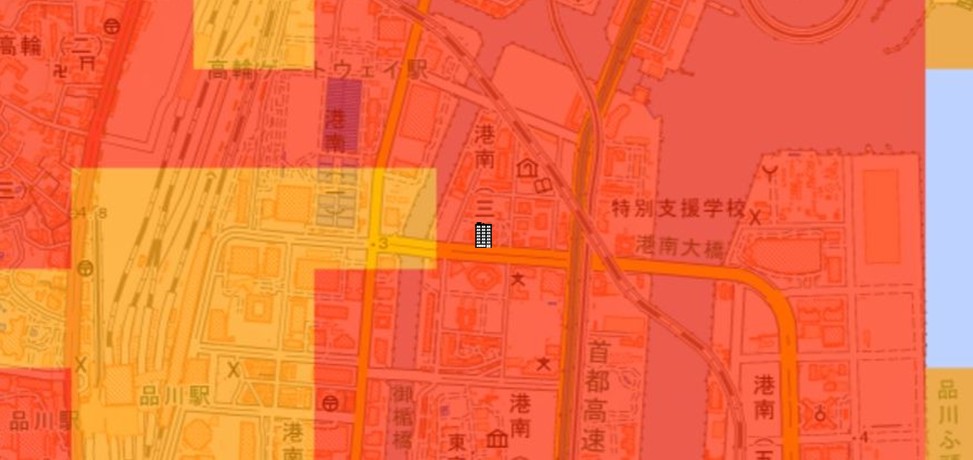 東京都の「地震に関する地域危険度測定調査」によると、「港南3丁目」の地域危険度は“1”(※)であり、災害に強い地域であるとされています。