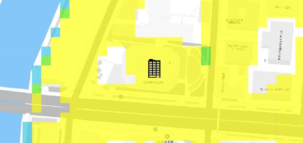 ●「液状化の可能性がある地域」及び「沖積層の堆積エリア」に該当する、湾岸の埋立地に位置します。