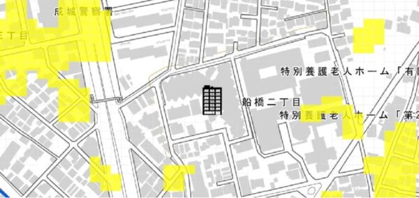 東京都の「地震に関する地域危険度測定調査」によると、「船橋2丁目」の地域危険度は“2”(※)であり、災害に比較的強い地域であるとされています。