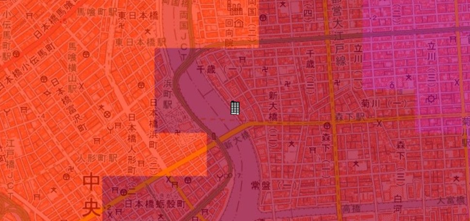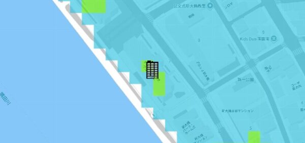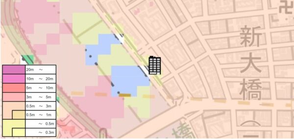 隅田川沿いの低地帯に位置し、高潮でも約1.7mの浸水可能性が指摘されているので、浸水リスクは顕在です。
