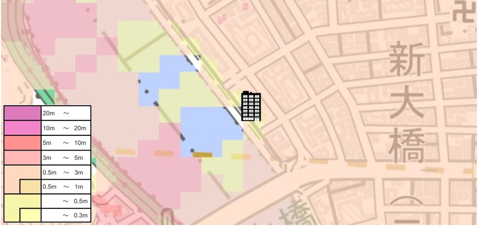 | 【対水害の評価】 [標高・地形] ●標高約2m~3m、東京東部の低地帯に位置します。 ●隅田川沿いです。 〔浸水深〕 ●高潮により最大約1.7mの浸水可能性が指摘されています。 ●内水氾濫・洪水により0.5m~3m未満の浸水可能性が指摘されています。 〔対水害総評〕 ●隅田川沿いの低地帯に位置し、約1.7mの浸水可能性が指摘されているので、浸水リスクは非常に大きいです。 ●想定を超える高潮や大雨が発生した場合には、浸水被害が拡大する可能性のある立地です。 |