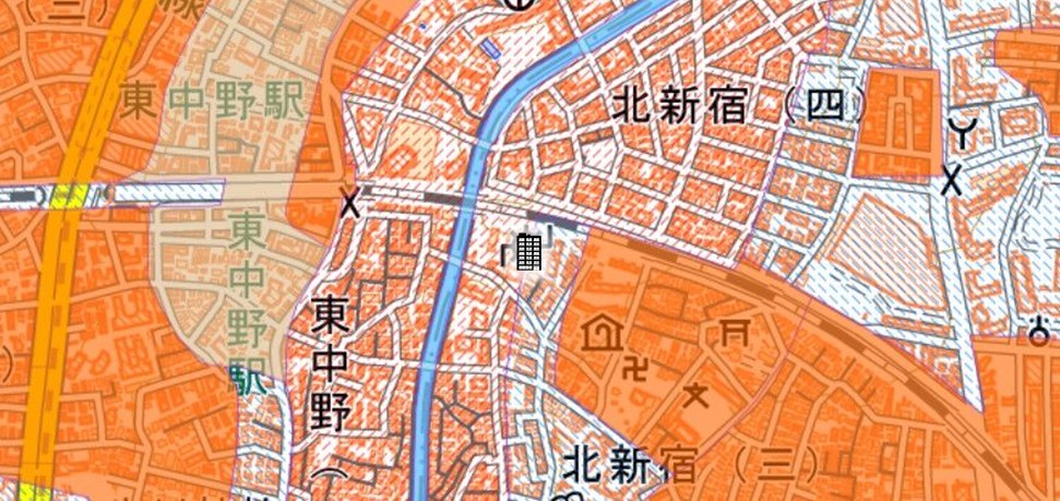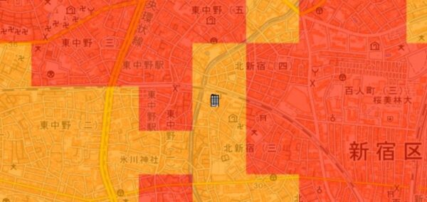 東京都の「地震に関する地域危険度測定調査」によると、「北新宿3丁目」の地域危険度は“3”(※)であり、災害リスクが多少残る地域であるとされています。