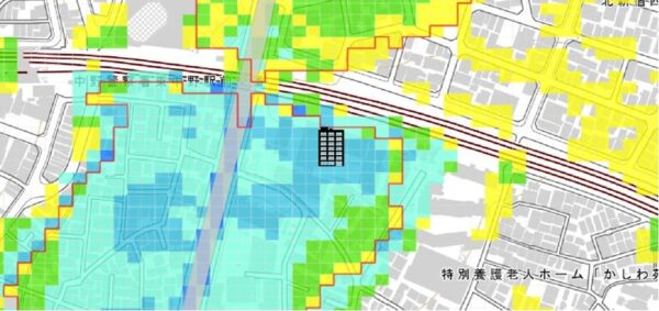 想定を超える大雨が降った場合には、浸水被害が拡大する可能性のある立地です。