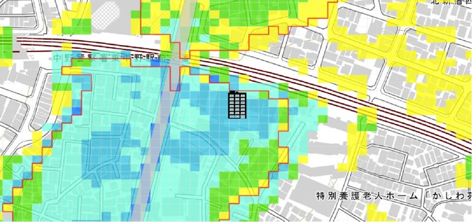 神田川の氾濫浸水区域内に位置し、約2.4mの浸水可能性が指摘されているので、浸水リスクは大きいです。