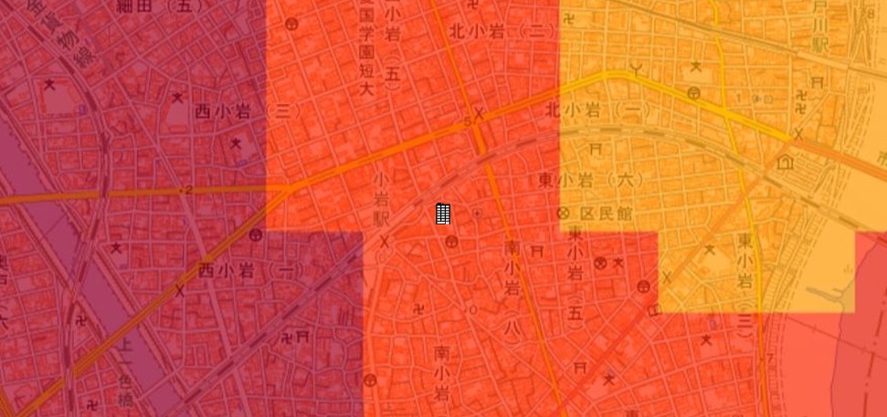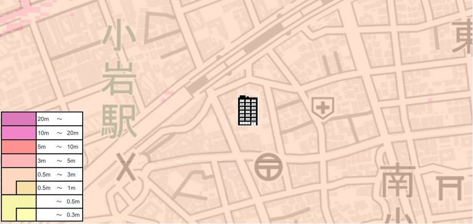 | 【対水害の評価】 [標高・立地] ●標高2mほど、東京東部の低地帯に位置します。 〔浸水深〕 ●高潮により最大約1.8mの浸水可能性が指摘されています。 ●内水氾濫・洪水により0.5m~3m未満の浸水可能性が指摘されています。 〔対水害総評〕 ●標高2mほどの低地帯に位置し、高潮で約1.8m等の浸水可能性が指摘されているので、浸水リスクは大きいです。 ●想定を超える高潮や大雨が発生した場合は、浸水被害が拡大する可能性のある立地です。 |