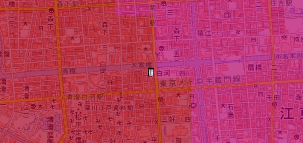 | 【対水害の評価】 [標高・地形] ●標高約0m~4m、東京東部の低地帯に位置します。 〔浸水深〕 ●高潮により最大約2.7mの浸水可能性が指摘されています。 ●内水氾濫・洪水により0.5m~3m未満の浸水可能性が指摘されています。 〔対水害総評〕 ●小名木川河岸の低地帯に位置し、約2.7mの浸水可能性が指摘されているので、浸水リスクは大きいです。 ●想定を超える高潮や大雨が発生した場合には、浸水被害が拡大する可能性のある立地です。 |