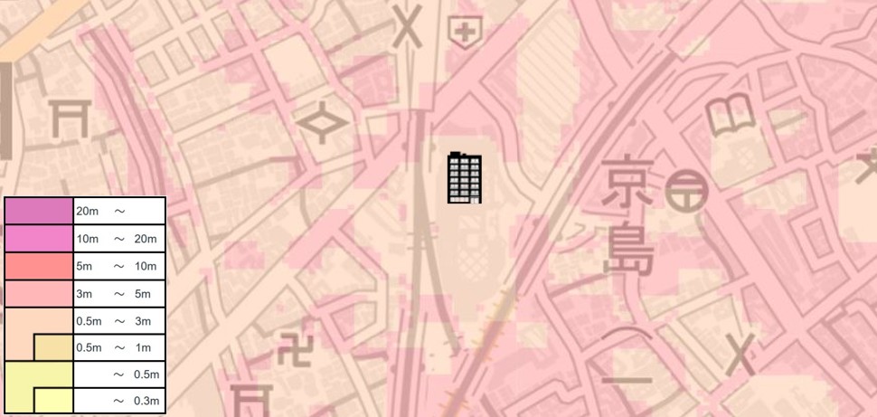 「海抜ゼロメートル地帯」に位置し、3mを超える浸水可能性が指摘されているので、浸水リスクは非常に大きいです。