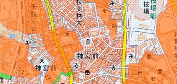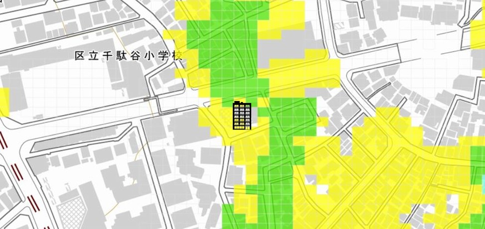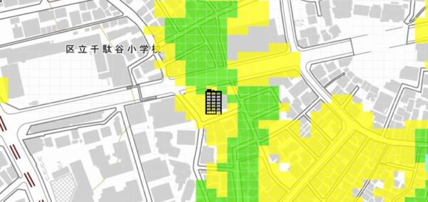 | 【対水害の評価】 [標高・地形] ●標高約23m~24mの谷底低地に位置します。 ●暗渠である芝川(代々木川とも呼ばれていたらしい)の流域に当たります。 〔浸水深〕 ●最大約0.5mの浸水可能性が指摘されています。 〔対水害総評〕 ●暗渠である芝川流域に位置し、約0.5mの浸水可能性が指摘されているので、浸水リスクは顕在です。 ●想定を超える大雨が降った場合には、浸水被害が拡大する可能性のある立地です。 |