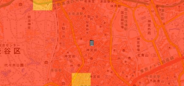 ●東京都の「地震に関する地域危険度測定調査」によると、「神宮前2丁目」の地域危険度は“2”(※)であり、災害に比較的強い地域であるとされています。
