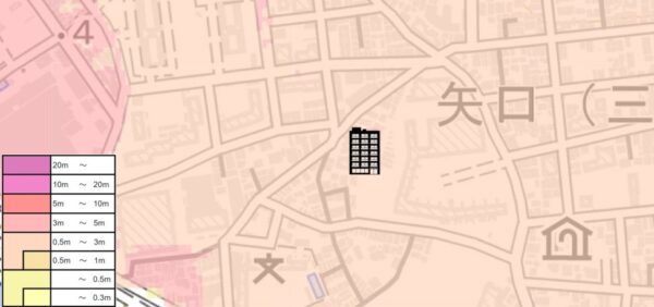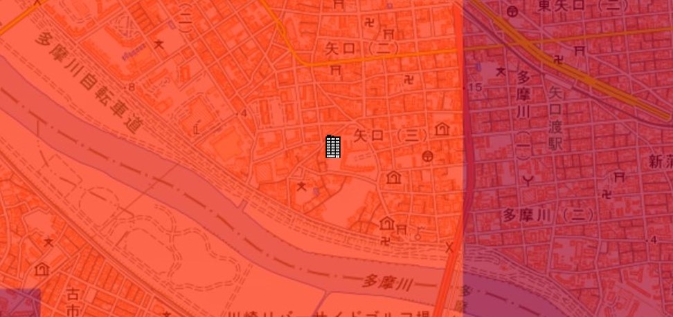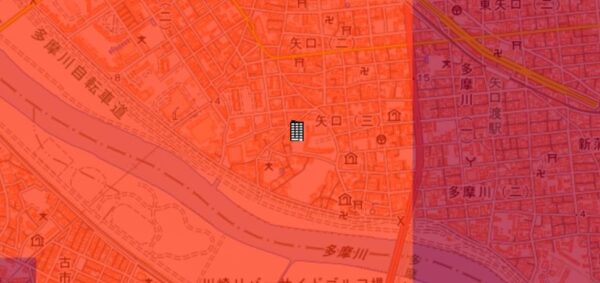 | 【対水害の評価】 [標高・立地] ●標高約4m~5m、多摩川河口周辺に広がる低地(一部、自然堤防)に位置します。 〔浸水深〕 ●洪水・内水氾濫により0.5m~3mの浸水可能性が指摘されています。 〔対水害総評〕 ●多摩川河口周辺に広がる低地に位置し、0.5m以上の浸水可能性が指摘されているので、浸水リスクは顕在です。 ●想定を超える大雨が降った場合は、浸水被害が拡大する可能性のある立地です。 |