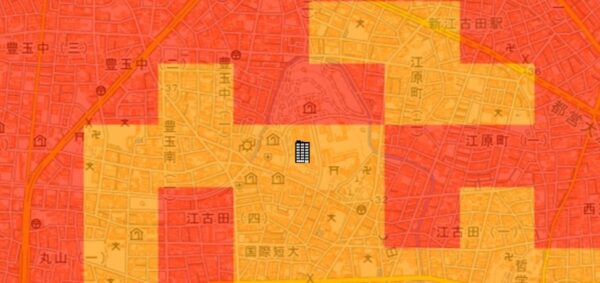 | 【対地震の評価】 [地盤] ●表層地盤増幅率が優良レベルの台地に位置するので、大きな地盤リスクはないでしょう。 〔建物〕 ●概ねシンプルかつどっしりとした形状の建物なので、損壊リスクは低いでしょう。 〔対地震総評〕 ●表層地盤増幅率が優良レベルの台地の上に建つ、損壊リスクの低い建物なので、大地震の際にも大きな損傷を受ける可能性が低い物件といえます。 |