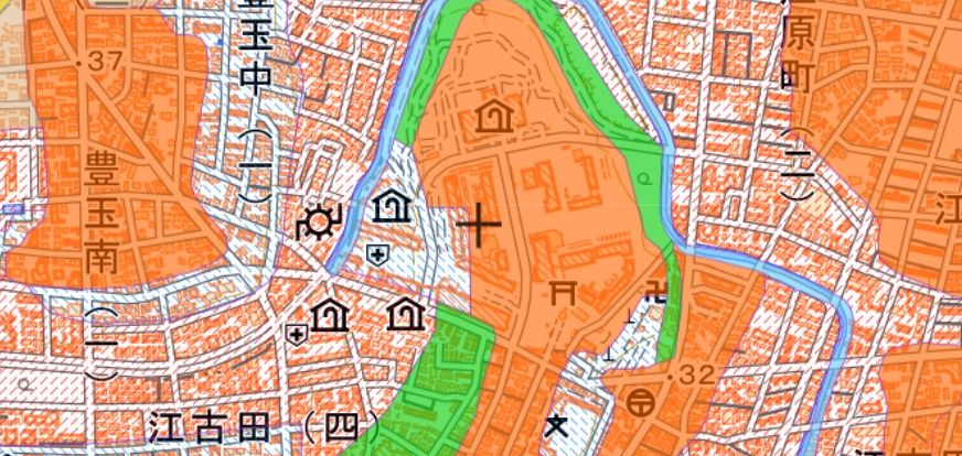 | 【対水害の評価】 [標高・地形] ●標高35m超の台地に位置します。 〔浸水深〕 ●内水氾濫等により最大約0.5mの浸水可能性が指摘されています。 〔対水害総評〕 ●標高や地形からみて、敷地全体に大きな浸水リスクはないと考えます。 ※想定を超える大雨が降った場合には、内水氾濫が拡大する可能性があります。 |