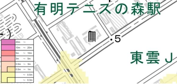 ●浸水可能性は指摘されていませんが、標高4m未満の湾岸の埋立地に位置するので、想定外の浸水被害はあり得ます。