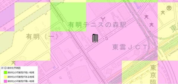●「液状化の可能性が高い地域」及び「沖積層の堆積エリア」に該当する、湾岸の埋立地に位置します。