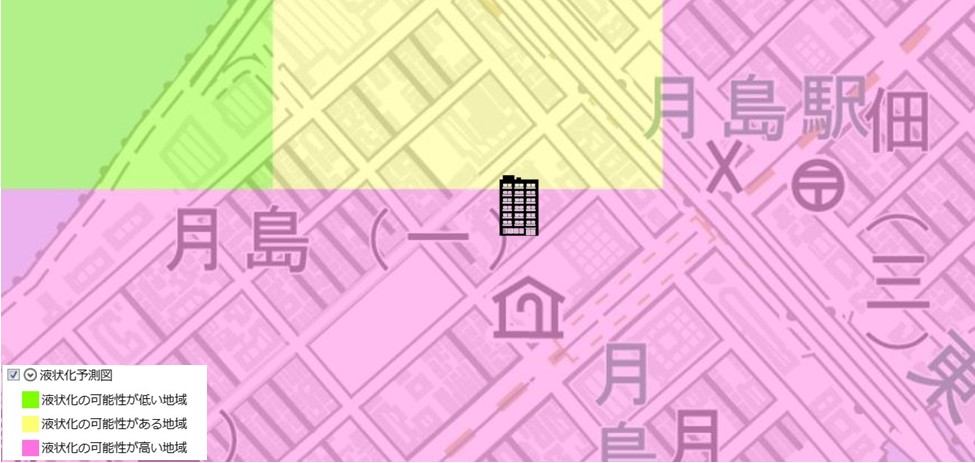 ●東京都建設局が公開している「東京の液状化予測図」では、敷地の過半が「液状化の可能性が高い地域」に含まれています。