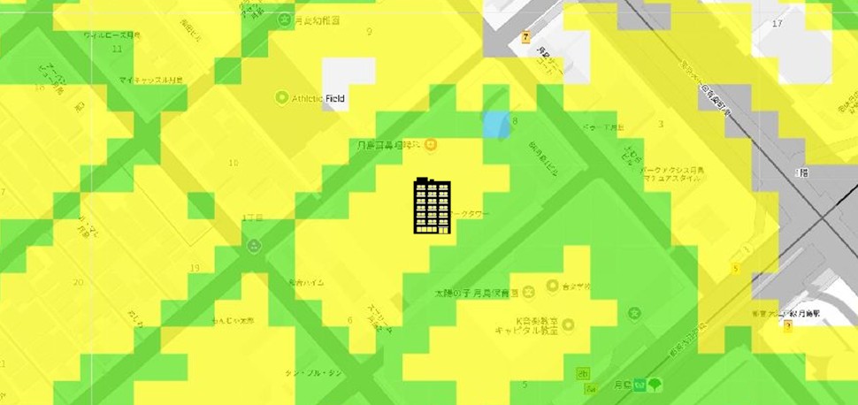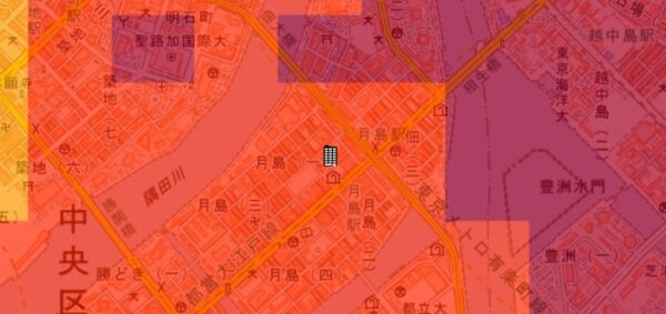 ●東京都の「地震に関する地域危険度測定調査」によると、「月島1丁目」の地域危険度は“3”(※)であり、災害リスクが多少残る地域であるとされています。