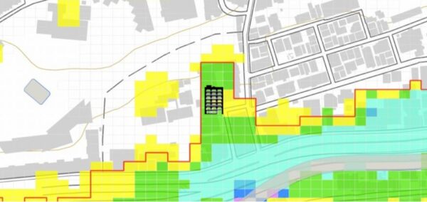 古川の氾濫浸水区域内に位置し、約0.7mの浸水可能性が指摘されているので、浸水リスクは顕在です。