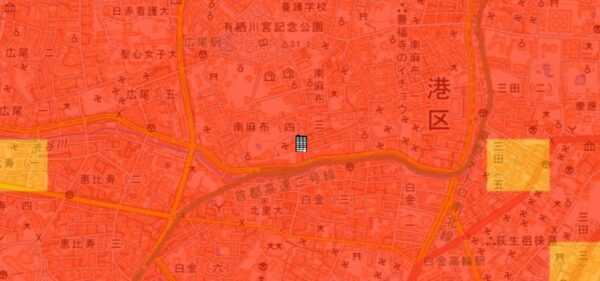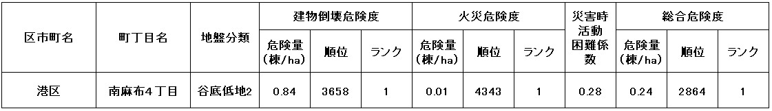 ●東京都の「地震に関する地域危険度測定調査」によると、「南麻布4丁目」の地域危険度は”1”(※)であり、災害に強い地域であるとされています。