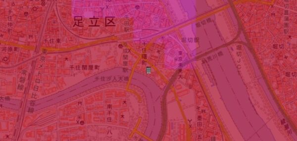 | 【対水害の評価】 [標高・地形] ●標高約1m~5m、隅田川沿いの低地帯に位置します。 〔浸水深〕 ●洪水・内水氾濫により、敷地の東側に3m~5m、西側に0.5m~3mの浸水可能性が指摘されています。 〔対水害総評〕 ●隅田川沿いの低地帯に位置し、3m以上の浸水可能性が指摘されているので、浸水リスクは非常に大きいです。 ●想定を超える大雨が降った場合には、浸水被害が拡大する可能性のある立地です。 |