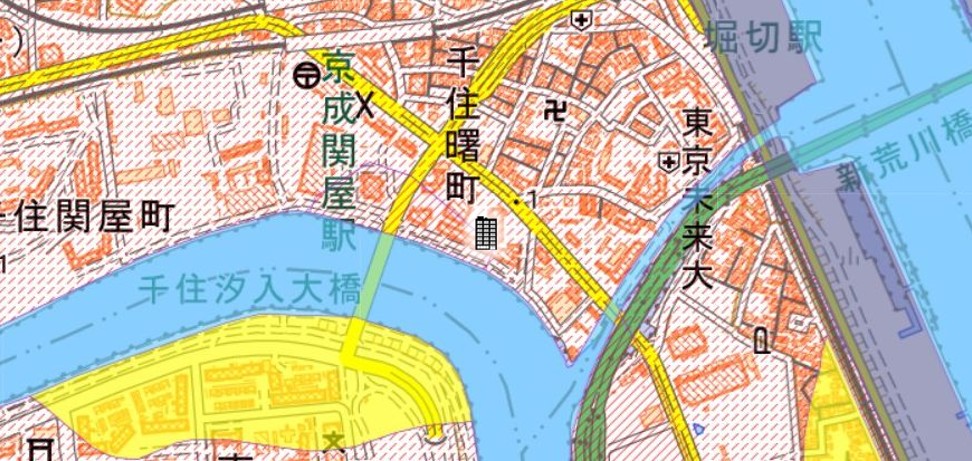 ●東京都の「地震に関する地域危険度測定調査」によると、「千住曙町」の地域危険度は“2”(※)であり、災害に比較的強い地域であるとされています。
