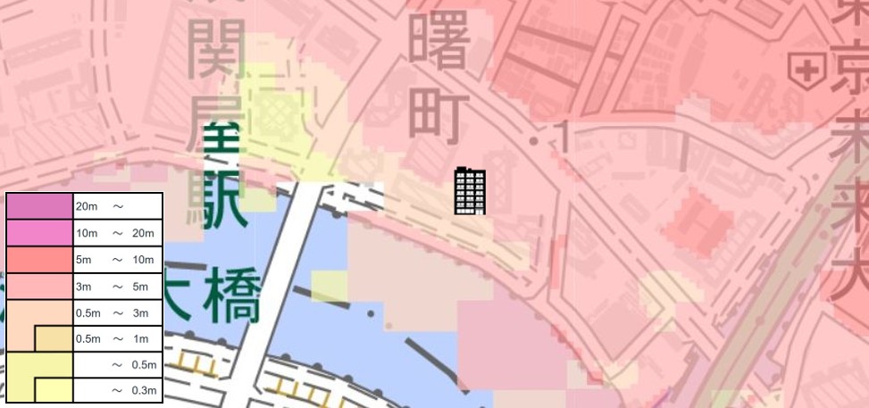 | 【対水害の評価】 [標高・地形] ●標高約1m~5m、隅田川沿いの低地帯に位置します。 〔浸水深〕 ●洪水・内水氾濫により、敷地の東側に3m~5m、西側に0.5m~3mの浸水可能性が指摘されています。 〔対水害総評〕 ●隅田川沿いの低地帯に位置し、3m以上の浸水可能性が指摘されているので、浸水リスクは非常に大きいです。 ●想定を超える大雨が降った場合には、浸水被害が拡大する可能性のある立地です。 |