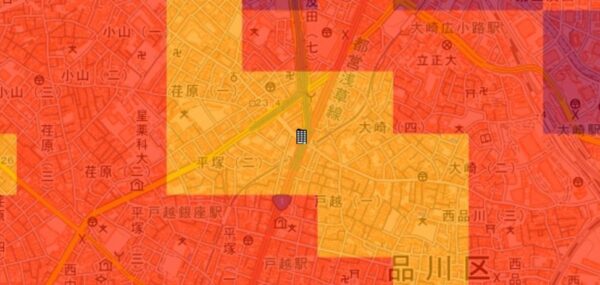 東京都の「地震に関する地域危険度測定調査」によると、「西五反田6丁目」の地域危険度は”2”(※)であり、災害に比較的強い地域であるとされています。