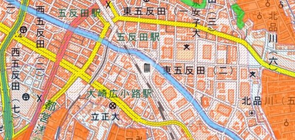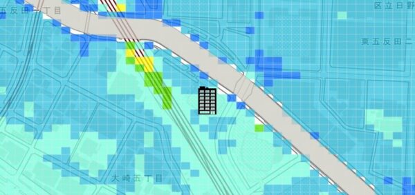 | 【対水害の評価】 [標高・地形] ●標高約4m、目黒川沿いの谷底低地に位置します。 ●「目黒川が氾濫した場合の浸水区域」に含まれます。 〔浸水深〕 ●最大約2.3mの浸水可能性が指摘されています。 〔対水害総評〕 ●目黒川沿いで、約2.3mの浸水可能性が指摘されているので、浸水リスクは大きいです。 ●想定を超える大雨が降った場合には、浸水被害が拡大する可能性のある立地です。 |