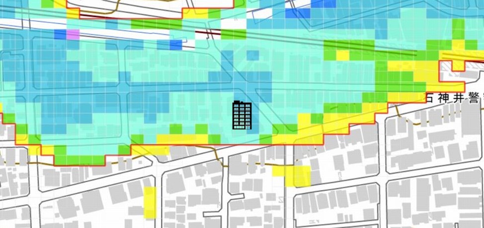 石神井川の氾濫浸水区域内に位置し、2m超の浸水可能性が指摘されているので、浸水リスクは大きいです。